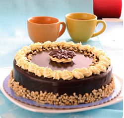 CHOCO SANSRIVALFive layers of sansrival dough filled with sweet and creamy sansrival icing, chocolate ganache and cashew nuts. The surface and sides of the cake is decorated with cashew nuts and accented with a chocolate flower topper on top center of the cake. From Goldilocks. |