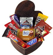 Chocolates in a heart boxIncludes: Kit kat, Snickers Almond Bar, Maltese, M&M, pack Kisses, Ritter Sport, Cad bury.(10 items) |