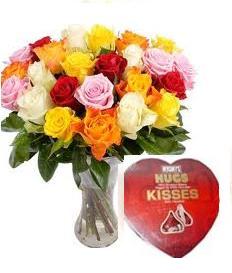 12 multicolored roses w/hershey's heart12 multicolored roses w/hershey's heart red pink orange pomelo yellow |