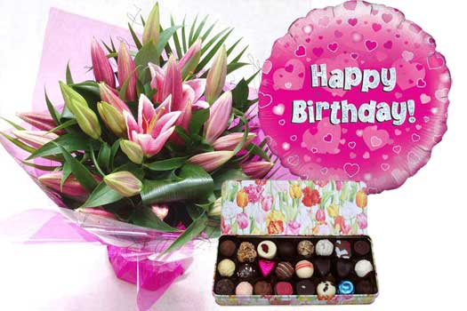 Flowers, Belgian Chocolates and BalloonPink Happy Birthday Gift Package - Flowers, Belgian Chocolates and Balloon chocolates 100 gm |