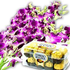Purple Orchid Bouquet With Chocolate BoxOur Purple Orchid Bouquet with Chocolate Box consists of a bunch of purple orchids with a 200 gm box of Ferero Rocher Chocolates. Florista India Pvt. Ltd offers Purple Orchid Bouquet with Chocolate Box. We supply a wide range of flower arrangements and bouquets for decoration and gift in various occasions and festivals. The Purple Orchid Bouquet with Chocolate Box, known by the name "Chocolates n Violets" comes with six stems of orchids and is suitable for used as an anniversary gift. |