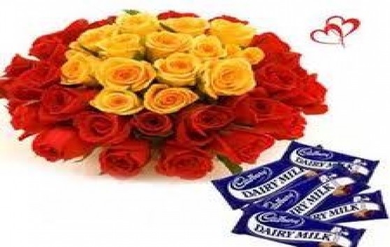 Sweet of youV Day- Bouquet of 36 Red and Yellow Roses with 6 Diary Milk Chocolates, 65 g each |