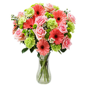 Pretty In pink luvDescription Make her laugh! A deliciously sweet gift, reminiscent of childhood- candies and lollipops. Send her one dozen pink roses, gerberra daisies, green carnations, and mint green buttons, a sweet way to share your thoughts. Dozen Pink Roses, Gerberra Daisies, Green Carnations, And Mint Green Buttons |