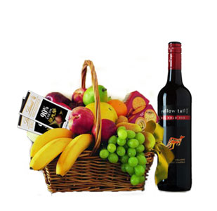 6 items Fruit w/ Sparkling juice ,cookies, cracker & Lindt chocolateBasket contains: