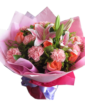 A Simple Greeting9 stems pink carnations, 9 stems pink roses and 1 stalks pink lilies with fresh solidago embellished. Writing a simple greeting such as hello, good day. |