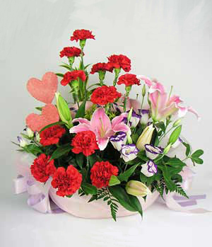 Flowes For Mother Basket12 red carnations, 1 stalks pink perfume lily, match balloonflowers, match green leaves, 2 pink paper hearts, flowers basket. (The picture is only for reference and the main items are the same, the effect is guaranteed.) |
