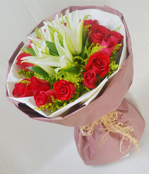 Love Unlimited16 red roses and 5 white perfume lilies with solidago. White paper inside and coffee crepe paper outsite, exquisite round style hand bouquet. |