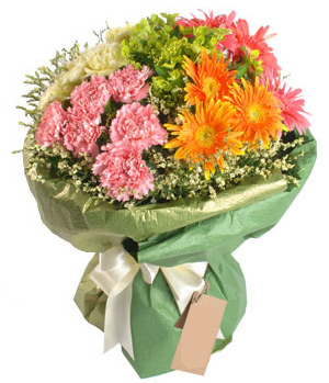 More Than A WordPink, yellow carnations each 6 stems. Pink, gold gerberas each 3 stems. Crystal grass and green leaves fullness. Two-color gift paper wrapped, champagne ribbon tied. - Order two days ahead. |