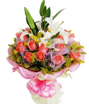 My all World16 pink rose in independent packaging with 2 white perfume lilies, match solidago. Send round style bouquet express feelings of because I have already filled your heart, you're my whole world. |