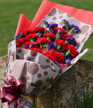 Red Carnations Bouquet19 stems red carnations with forget-me-not decorated, fan shape wrapped. - The picture is only for reference and the main items are the same, the effect is guaranteed. |