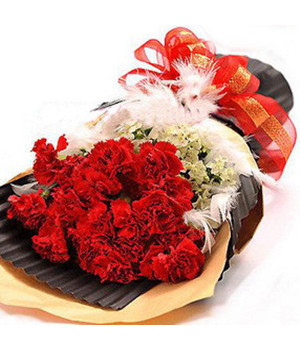 Thanks Mom18 red carnations with white flower and feathers, brown and orange paper fan-shaped pacakge. - The picture is only for reference and the main items are the same, the effect is guaranteed. |